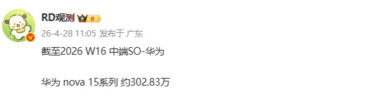 【CNMO科技消息】4月28日,数码博主@RD观测 爆料称,截至2026年第16周,华为nova 15系列累计销量约302.83万台,正式突破300万大关。